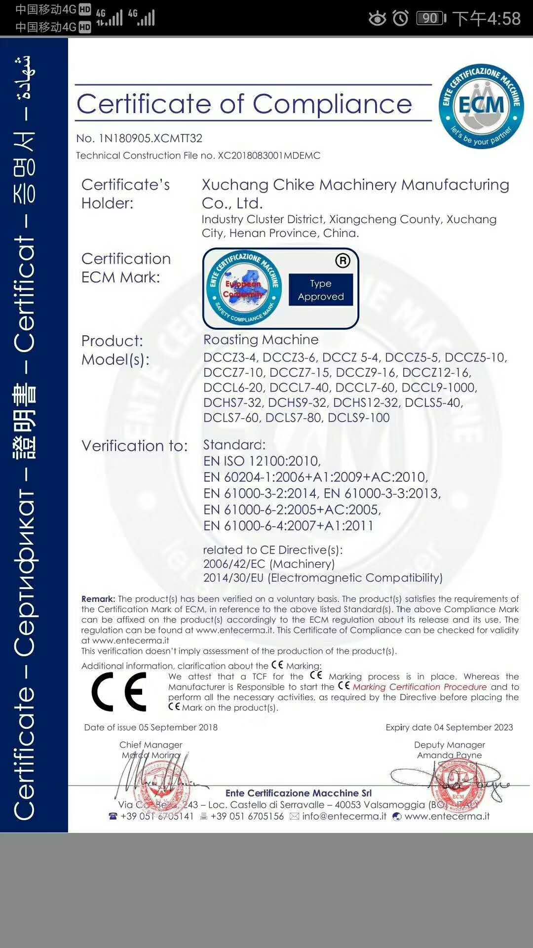 許昌智工產品已經通過歐盟CE認證,所有產品已經通過安全,衛生,環保和消費者保護等一系列歐盟標準要求。